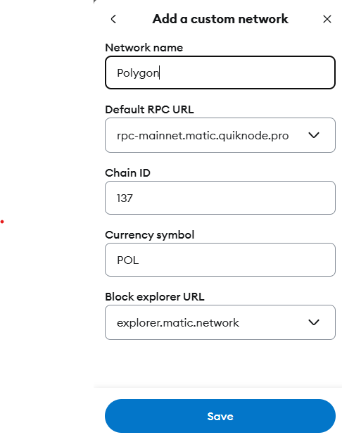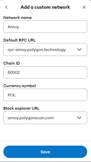 Save: Click "Save" to add the Polygon testnet to your MetaMask.
